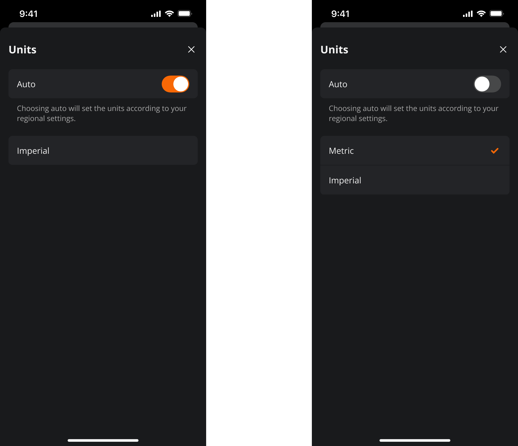 In Karta Cockpit kannst du zwischen metrischen (km/h) und imperialen (mph) Einheiten wählen. Standardmäßig ist Auto aktiviert, das sich nach den Regionseinstellungen deines Geräts richtet. Du kannst den Automatikmodus jedoch deaktivieren und die gewünschte Einheit manuell auswählen.